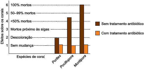 Biólogos marinhos da Universidade da Califórnia observaram que as algas que se estabelecem próximas a corais das espécies Porites, Pocillopora e Montipora podem secretar polissacarídeos em excesso. Esses nutrientes alimentam microrganismos aeróbios que se proliferam rapidamente ao redor desses corais, levando-os à morte. No entanto, perceberam que os microrganismos não parasitavam os corais nem produziam substâncias danosas. Para entender esse fenômeno natural, os biólogos criaram corais em recipientes com e sem algas e descobriram que os corais sobreviviam bem quando as algas estavam ausentes, mas sofriam alta mortalidade quando elas estavam presentes. Em outro conjunto de recipientes, fizeram o mesmo experimento, mas trataram a água com antibiótico. O gráfico compara o efeito do antibiótico sobre os corais dos recipientes que também continham algas.