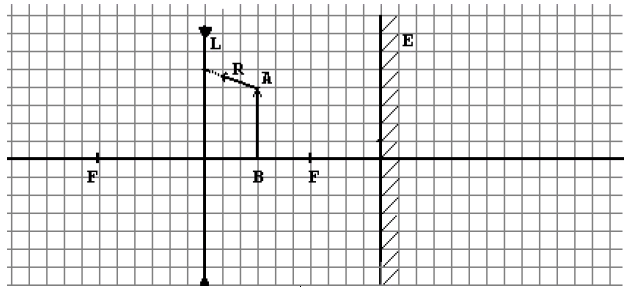 Na figura abaixo, em escala, estão representados uma lente L delgada, divergente, com seus focos F, e um espelho plano E, normal ao eixo da lente. Uma fina haste AB está colocada normal ao eixo da lente. Um observador O, próximo ao eixo e à esquerda da lente, mas bastante afastado desta, observa duas imagens da haste. A primeira, A1B1, é a imagem direta de AB formada pela lente. A segunda, A2B2, é a imagem, formada pela lente, do reflexo A’B’ da haste AB no espelho E.