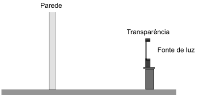 Uma figura gravada em uma folha de plástico (transparência) foi projetada sobre uma parede branca, usando-se uma fonte de luz e uma única lente, colocada entre a folha e a parede, conforme esquema ao lado.