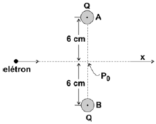 Duas pequenas esferas iguais, A e B, carregadas, cada uma, com uma carga elétrica Q igual a – 4,8 x 10–9 C, estão fixas e com seus centros separados por uma distância de 12 cm. Deseja-se fornecer energia cinética a um elétron, inicialmente muito distante das esferas, de tal maneira que ele possa atravessar a região onde se situam essas esferas, ao longo da direção x, indicada na figura, mantendo-se eqüidistante das cargas.