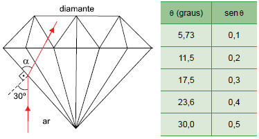 A figura representa um raio de luz monocromática propagando-se no ar e, em seguida, no diamante. Considerando o índice de refração absoluto do ar igual a 1,0 e baseando-se nas informações fornecidas, calcule: