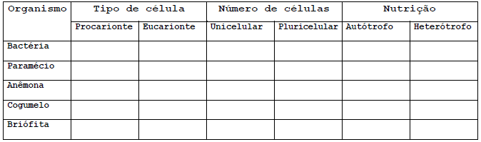 Preencha a tabela abaixo, assinalando as características de cada organismo indicado na primeira coluna: