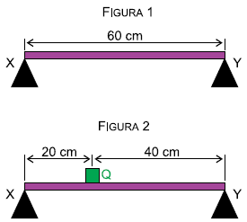 Uma barra homogênea em forma de paralelepípedo, de massa 8,0 kg e comprimento 60 cm, é sustentada em suas extremidades pelos apoios X e Y (figura 1). Um objeto Q, de massa 6,0 kg e dimensões desprezíveis, é colocado sobre essa barra, distando 20 cm da extremidade X (figura 2).