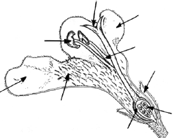 c) Identifique com a letra “C” a seta que aponta a estrutura que irá se desenvolver dando origem ao fruto.