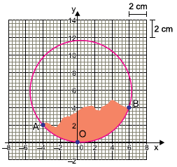 Uma expedição arqueológica encontrou um pedaço de um prato de cerâmica antigo, supostamente circular. Para estimar o tamanho do prato, os arqueólogos desenharam o pedaço de cerâmica encontrado, em tamanho real, em um plano cartesiano de origem O(0, 0). A circunferência do prato passa pela origem do plano cartesiano e pelos pontos A(– 4, 2) e B(6, 4), como mostra a figura.