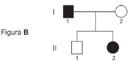 No heredograma (figura B), os indivíduos I-1 e II-2 são afetados por uma doença que tem herança dominante ligada ao X.