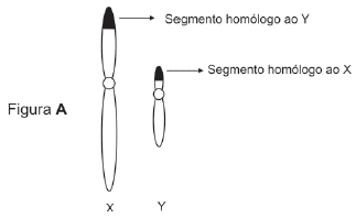 A figura A abaixo mostra o par de cromossomos sexuais humanos X e Y. Esses cromossomos emparelham-se na meiose, apenas pelos segmentos homólogos que possuem nas extremidades de seus braços curtos. Ocorre permuta entre esses segmentos.