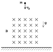 Uma partícula, de massa m e com carga elétrica Q, cai verticalmente com velocidade constante v0. Nessas condições, a força de resistência do ar pode ser considerada como Rar = kv, sendo k uma constante e v a velocidade. A partícula penetra, então, em uma região onde atua um campo magnético uniforme e constante B, perpendicular ao plano do papel e, nele entrando, conforme a figura. A velocidade da partícula é, então, alterada, adquirindo, após certo intervalo de tempo, um novo valor vL, constante. (Lembre-se de que a intensidade da força magnética |FM| = |q| |v| |B|, em unidades SI, para v perpendicular a B).