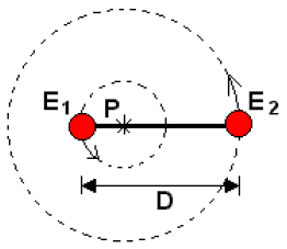 Um astrônomo, ao estudar uma estrela dupla E1-E2, observou que ambas executavam um movimento em torno de um mesmo ponto P, como se estivessem ligadas por uma barra imaginária. Ele mediu a distância D entre elas e o período 7 de rotação das estrelas, obtendo T = 12 dias. Observou, ainda, que o raio R1, da trajetória circular de E1, era três vezes menor do que o raio R2, da trajetória circular de E2. Observando essas trajetórias, ele concluiu que as massas das estrelas eram tais que M1 = 3 M2. Além disso, supôs que E1 e E2 estivessem sujeitas apenas à força gravitacional entre elas. A partir das medidas e das considerações do astrônomo: