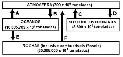 No esquema abaixo, os retângulos representam os quatro maiores reservatórios do elemento carbono em nosso planeta e as setas indicam o fluxo do carbono entre esses reservatórios.