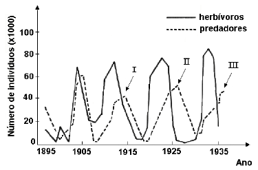 O gráfico abaixo representa o crescimento de uma população de herbívoros e da população de seus predadores: