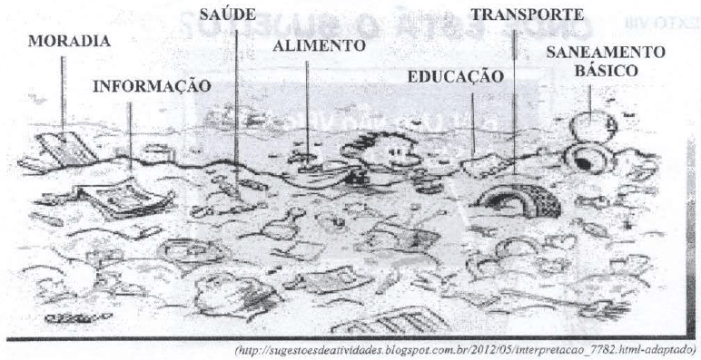 Observe o desenho acima, no qual uma criança se encontra em um lixão. Podemos ver que ela está rodeada de resto de construção, jornal, seringas, frutas roídas, folhas de caderno, pneu e vaso sanitário. Esta charge faz uma crítica social direta.