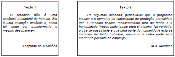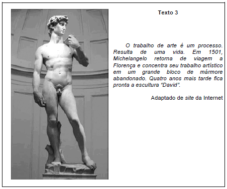 INSTRUÇÃO: Os três textos acima apresentam diferentes visões de trabalho. O primeiro procura conceituar essa atividade e prever seu futuro. O segundo trata de suas condições no mundo contemporâneo e o último, ilustrado pela famosa escultura de Michelangelo, refere-se ao trabalho de artista. Relacione esses três textos e com base nas idéias neles contidas, além de outras que julgue relevantes, redija uma DISSERTAÇÃO EM PROSA, argumentando sobre o que leu acima e também sobre os outros pontos que você tenha considerado pertinentes.