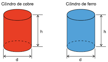 Dois cilindros retos idênticos, um de cobre (coeficiente de dilatação linear igual a 1,7 x 10–5 ºC–1) e outro de ferro (coeficiente de dilatação linear igual a 1,2 x 10–5 ºC–1), têm, a 0 ºC, volumes iguais a 8,0 x 102 cm3 e diâmetros das bases iguais a 10 cm.