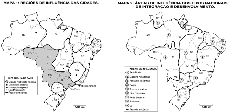 Observe os dois mapas acima. Ambos representam diferentes regionalizações do espaço brasileiro. O de nº 1 apóia-se nos conceitos de “pólo” e “hierarquia urbana” e o de nº 2, no de “eixo de integração e desenvolvimento”.