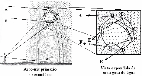 Ele então apresentou a figura onde estão representadas as trajetórias para os arco-íris primário e secundário. Determinar o ângulo entre o raio incidente na gota, AB, e o incidente no olho do observador, DE, no caso do arco-íris primário, em termos do ângulo de incidência, e do índice de refração da água na. Considere o índice de refração do ar n = 1.