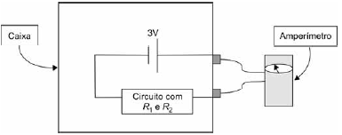 Em uma aula de física, os estudantes receberam duas caixas lacradas, C e C’, cada uma delas contendo um circuito genérico, formado por dois resistores (R1 e R2), ligado a uma bateria de 3 V de tensão, conforme o esquema da figura abaixo. Das instruções recebidas, esses estudantes souberam que os dois resistores eram percorridos por correntes elétricas não nulas e que o valor de R1 era o mesmo nas duas caixas, bem como o de R2. O objetivo do experimento era descobrir como as resistências estavam associadas e determinar seus valores. Os alunos mediram as correntes elétricas que percorriam os circuitos das duas caixas, C e C’, e obtiveram os valores I = 0,06 A e I’ = 0,25 A, respectivamente.