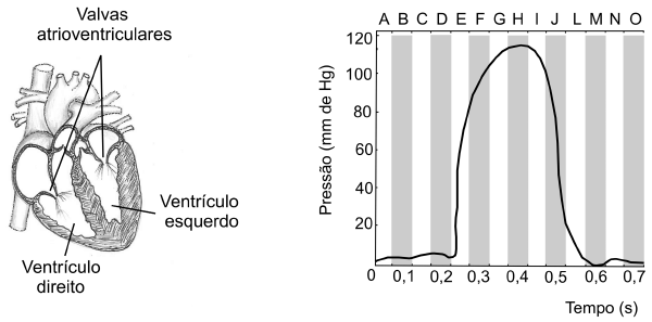 O esquema à esquerda mostra um coração humano em corte. À direita, o gráfico mostra a variação da pressão sangüínea no ventrículo esquerdo durante um ciclo cardíaco, que dura cerca de 0,7 segundo.