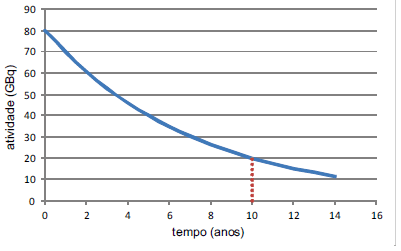 O câncer de mama é o mais reincidente nas mulheres. Por essa razão, mesmo quando é feita a retirada cirúrgica do tumor, a radioterapia externa (teleterapia) é frequentemente indicada para tratar a doença residual. Em geral, utiliza-se como fonte radioativa o cobalto-60 que, em seu processo de decaimento, emite partícula beta negativa e raios gama. O gráfico mostra a atividade aproximada do 60Co em função do tempo.
