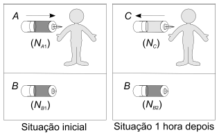 Uma substância radioativa, cuja meia-vida é de aproximadamente 20 minutos, pode ser utilizada para medir o volume do sangue de um paciente. Para isso, são preparadas duas amostras, A e B, iguais, dessa substância, diluídas em soro, com volume de 10 cm3 cada. Uma dessas amostras, A, é injetada na circulação sanguínea do paciente e a outra, B, é mantida como controle. Imediatamente antes da injeção, as amostras são monitoradas, indicando NA1 = NB1 = 160 000 contagens por minuto. Após uma hora, é extraída uma amostra C de sangue do paciente, com igual volume de 10 cm3, e seu monitoramento indica NC = 40 contagens por minuto.