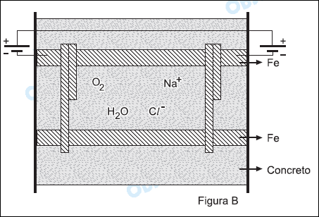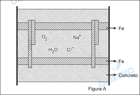 A corrosão da ferragem de estruturas de concreto ocorre devido à penetração de água através da estrutura, que dissolve cloretos e/ou sais provenientes da atmosfera ou da própria decomposição do concreto. Essa solução eletrolítica em contacto com a ferragem forma uma célula de corrosão. A Figura A, abaixo, ilustra esquematicamente a célula de corrosão formada. No caderno de soluções, faça uma cópia desta figura
