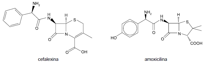 As fórmulas representam as estruturas dos antibióticos cefalexina e amoxicilina.