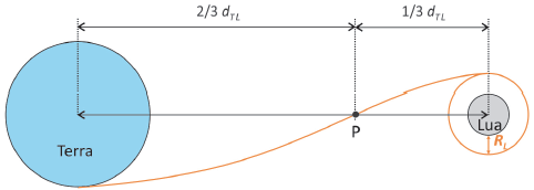 Considere que a trajetória de uma sonda com destino à Lua passa por um ponto P, localizado a 2/3 dT L do centro da Terra e a 1/3 dT L do centro da Lua, sendo dT L a distância entre os centros da Terra e da Lua.