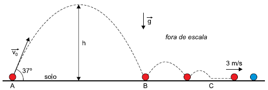 Em um jogo de bocha, uma pessoa tem como objetivo atingir uma bola azul parada sobre o solo plano e horizontal. Para isso, ela arremessa obliquamente, a partir do solo, no ponto A, uma bola vermelha, de mesma massa que a azul, com velocidade inicial v0 = 10 m/s, inclinada de um ângulo de 37º em relação à horizontal, tal que sen 37º = 0,6 e cos 37º = 0,8. Após tocar o solo no ponto B, a bola vermelha pula algumas vezes e, a partir do ponto C, desenvolve um movimento retilíneo, no sentido da bola azul. Imediatamente antes da colisão frontal entre as bolas, a bola vermelha tem velocidade igual a 3 m/s.