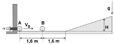 Duas pequenas esferas iguais, A e B, de mesma massa, estão em repouso em uma superfície horizontal, como representado no esquema ao lado. No instante t = 0 s, a esfera A é lançada, com velocidade V0 = 2,0 m/s, contra a esfera B, fazendo com que B suba a rampa à frente, atingindo sua altura máxima, H, em t = 2,0 s. Ao descer, a esfera B volta a colidir com A, que bate na parede e, em seguida, colide novamente com B. Assim, as duas esferas passam a fazer um movimento de vai e vem, que se repete.