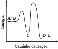 Considere a curva de variação da energia potencial das espécies A, B, C, D e E, envolvidas em uma reação química genérica, em função do caminho da reação, apresentada na figura ao lado. Suponha que a reação tenha sido acompanhada experimentalmente, medindo-se as concentrações de A, B e C em função do tempo.