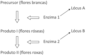 Em uma variedade de petúnia, as flores podem ser brancas, róseas ou roxas. Suponha que essas cores de flores resultem de pigmentos cuja síntese é determinada por genes com segregação independente que participam de uma mesma via metabólica, conforme esquematizado abaixo: