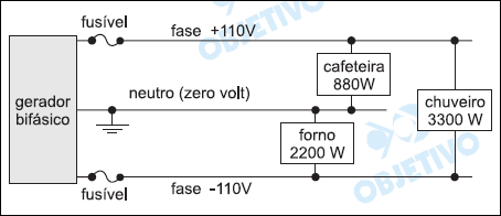 A figura representa o esquema simplificado de um circuito elétrico em uma instalação residencial. Um gerador bifásico produz uma diferença de potencial (d.d.p) de 220 V entre as fases (+110 V e –110 V) e uma ddp de 110 V entre o neutro e cada uma das fases. No circuito estão ligados dois fusíveis e três aparelhos elétricos, com as respectivas potências nominais indicadas na figura.