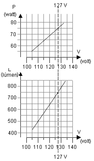 Os gráficos, apresentados abaixo, caracterizam a potência P, em watt, e a luminosidade L, em lúmen, em função da tensão, para uma lâmpada incandescente. Para iluminar um salão, um especialista programou utilizar 80 dessas lâmpadas, supondo que a tensão disponível no local seria de 127 V. Entretanto, ao iniciar-se a instalação, verificou-se que a tensão no local era de 110 V. Foi necessário, portanto, um novo projeto, de forma a manter a mesma luminosidade no salão, com lâmpadas desse mesmo tipo.
