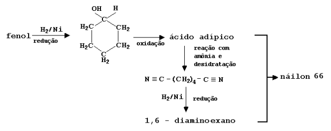 O ácido adípico pode ser obtido a partir do fenol e o 1,6-diaminoexano, a partir do ácido adípico, conforme esquema abaixo:
