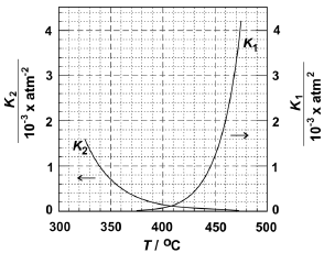 A reforma do gás natural com vapor de água é um processo industrial de produção de hidrogênio, em que também se gera monóxido de carbono. O hidrogênio, por sua vez, pode ser usado na síntese de amônia, na qual reage com nitrogênio. Tanto a reforma do gás natural quanto a síntese da amônia são reações de equilíbrio. Na figura, são dados os valores das constantes desses equilíbrios em função dos valores da temperatura. A curva de Krefere-se à reforma do gás natural e a de K2, à síntese da amônia.