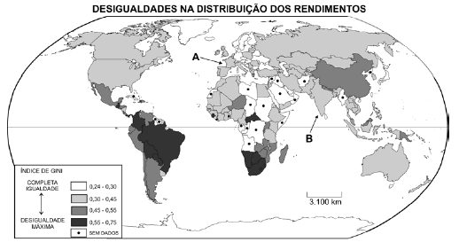 a) França (A) e Índia (B) ocupam a mesma classe estatística na representação acima sobre as desigualdades na distribuição dos rendimentos.
