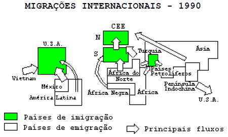 a) Nos últimos anos a situação apresentada no mapa praticamente se manteve, com algumas exceções. Comente o fato, analisando os principais fluxos migratórios e as razões que os originaram.