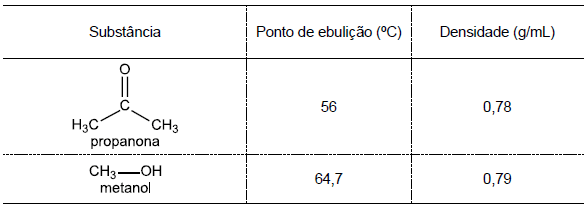 A tabela apresenta propriedades físicas da propanona e do metanol.