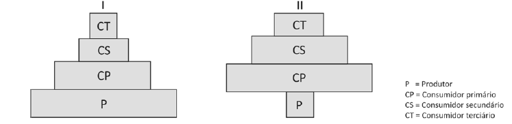 b) Desenhe as pirâmides de energia correspondentes às pirâmides de biomassa, para os dois ecossistemas indicados.