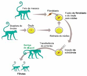 Pesquisadores chineses realizaram o seguinte experimento com cinomolgos (Macaca fascicularis), espécie de macacos do Sudeste Asiático: obtiveram fibroblastos (células do tecido conjuntivo) do feto de um macaco e, ao mesmo tempo, extraíram óvulos de uma macaca adulta e retiraram os núcleos desses óvulos. Cada óvulo anucleado foi fundido a uma célula de fibroblasto do feto. Uma substância foi injetada em cada célula reconstituída para reprogramar as moléculas de DNA do fibroblasto para retornarem ao estágio embrionário. Os embriões formados foram transferidos para uma macaca “mãe de aluguel”, que gestou os embriões. No fim do processo, dois filhotes nasceram.