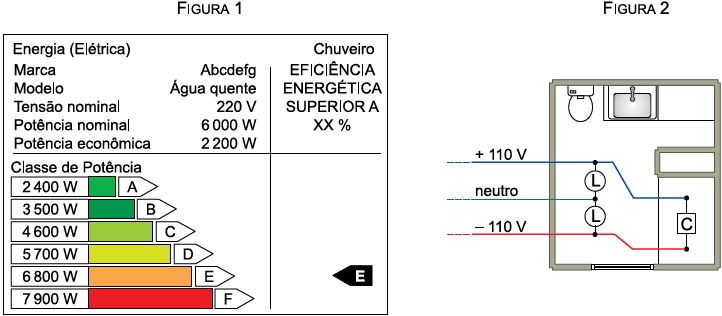 O Programa Brasileiro de Etiquetagem (PBE) tem o objetivo de orientar o consumidor quanto ao consumo e à eficiência energética dos principais eletrodomésticos nacionais. A figura 1 ilustra a etiqueta de um chuveiro elétrico, apresentando a tensão nominal de funcionamento e as potências nominal e econômica (potência máxima e mínima do chuveiro). Em um banheiro, foram instalados esse chuveiro (c) e duas lâmpadas idênticas (L), de valores nominais (110 V – 60 W) cada, conforme a figura 2.