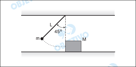 Quando solto na posição angular de 45° (mostrada na figura), um pêndulo simples de massa m e comprimento L colide com um bloco de massa M.