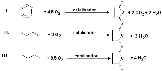 Analise os três processos industriais de produção de anidrido maléico, representados pelas seguintes equações químicas: