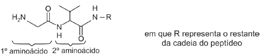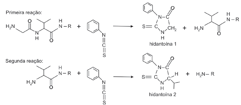 Para identificar os dois primeiros aminoácidos desse peptídeo e também a sequência de tais aminoácidos, foram efetuadas duas reações químicas. Na primeira reação, formaram-se uma hidantoína e um novo peptídeo com um aminoácido a menos. Esse novo peptídeo foi submetido a uma segunda reação, análoga à anterior, gerando outra hidantoína e outro peptídeo: