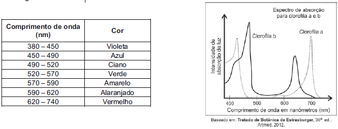 A tabela traz os comprimentos de onda no espectro de radiação eletromagnética, na faixa da luz visível, associados ao espectro de cores mais frequentemente percebidas pelos olhos humanos. O gráfico representa a intensidade de absorção de luz pelas clorofilas a e b, os tipos mais frequentes nos vegetais terrestres.