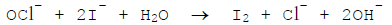 Para se determinar o teor, faz-se reagir um volume conhecido de alvejante com KI(aq) em excesso, ocorrendo a formação de I2, conforme a equação: