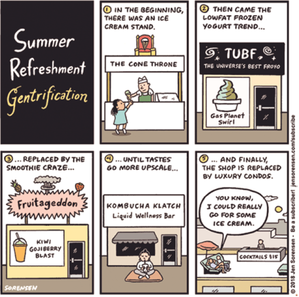 Examine a tira e releia o texto What is Gentrification? para responder, em português, aos itens a e b.