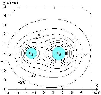 Na figura mostrada abaixo, estão representadas as superfícies equipotenciais do potencial eletrostático criado por duas esferas carregadas S1 e S2. Os centros das esferas estão sobre a reta OO’. A diferença de potencial entre duas linhas sucessivas é de 1 volt, e as equipotenciais de -3V e -4V estão indicadas no gráfico.
