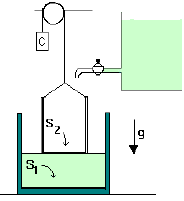 Um sistema industrial é constituído por um tanque cilíndrico, com 600 litros de água e área do fundo S1 = 0,6 m2, e por um balde, com área do fundo S2 = 0,2 m2. O balde está vazio e é mantido suspenso, logo acima do nível da água do tanque, com auxílio de um fino fio de aço e de um contrapeso C, como indicado na figura. Então, em t = 0 s, o balde passa a receber água de uma torneira, à razão de 20 litros por minuto, e vai descendo, com velocidade constante, até que encoste no fundo do tanque e a torneira seja fechada.