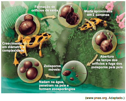 A figura mostra o ciclo de vida do fungo que tem os anfíbios como hospedeiros.
